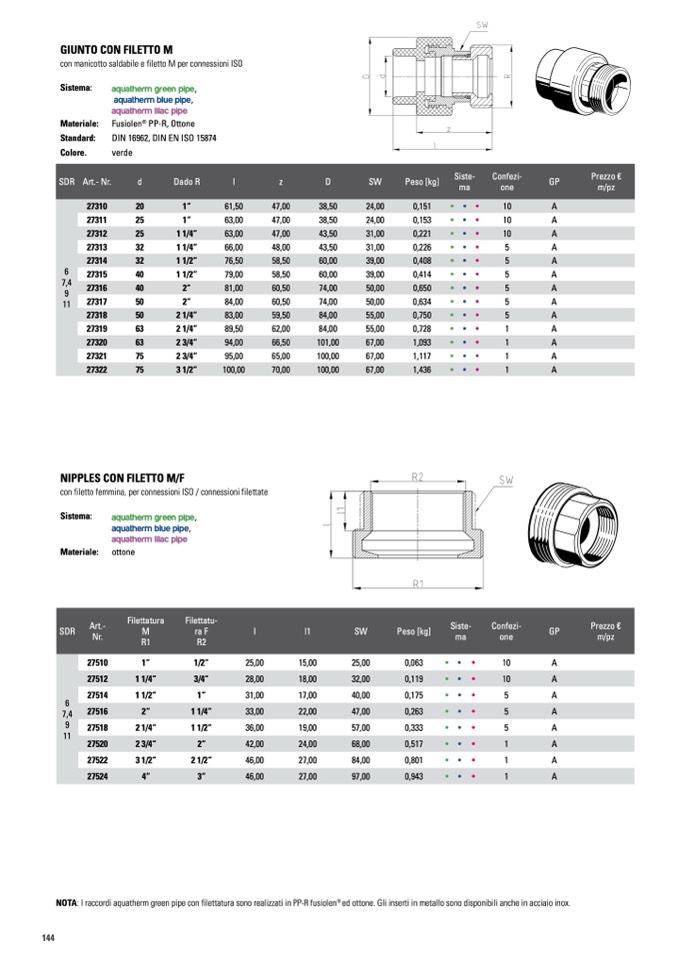 NOTA: I raccordi aquatherm green pipe con filettatura sono realizzati in PP-R fusiolen