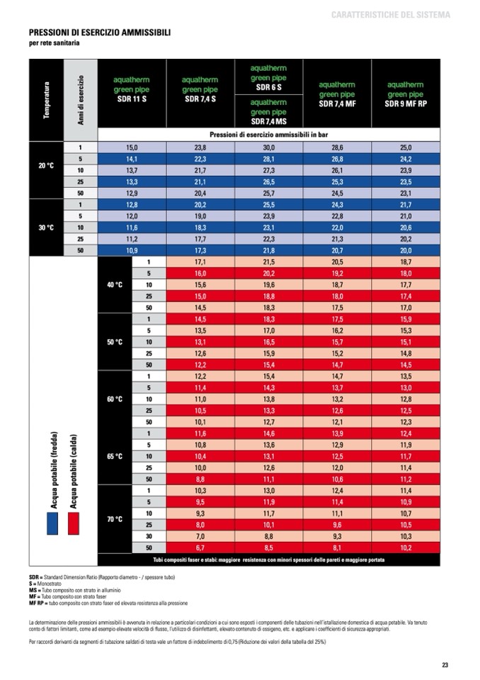 La determinazione delle pressioni ammissibili è avvenuta in relazione a particolari condizioni a cui sono esposti i componenti delle tubazioni nell’istallazione domestica di acqua potabile. Va tenuto
