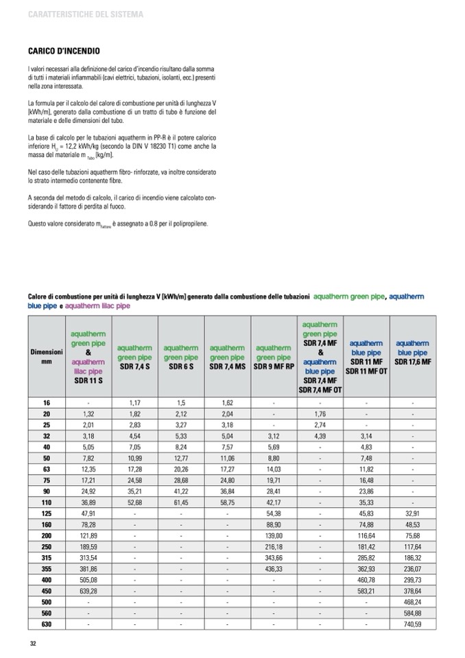 Calore di combustione per unità di lunghezza V [kWh/m] generato dalla combustione delle tubazioni aquatherm green pipe, aquatherm