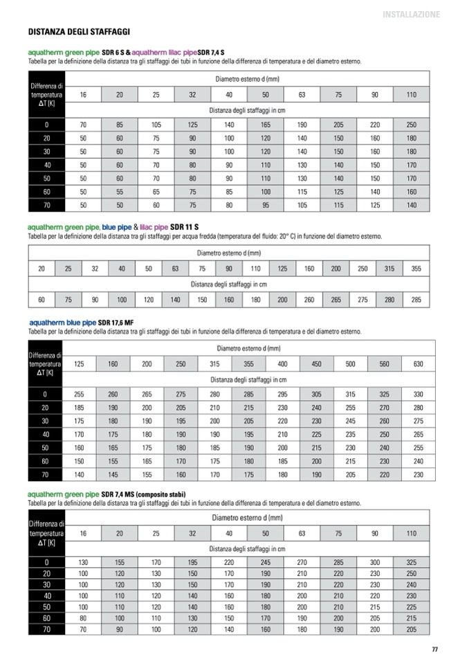 Tabella per la definizione della distanza tra gli staffaggi dei tubi in funzione della differenza di temperatura e del diametro esterno.