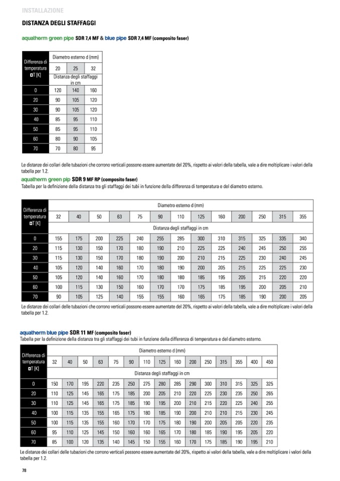 Le distanze dei collari delle tubazioni che corrono verticali possono essere aumentate del 20%, rispetto ai valori della tabella, vale a dire moltiplicare i valori della