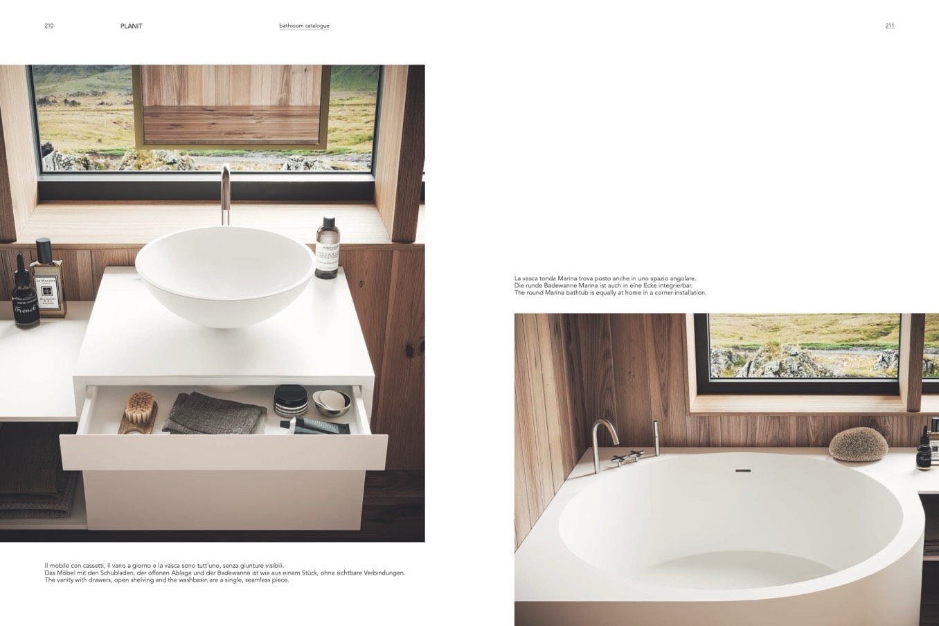 Il mobile con cassetti, il vano a giorno e la vasca sono tutt’uno, senza giunture visibili.