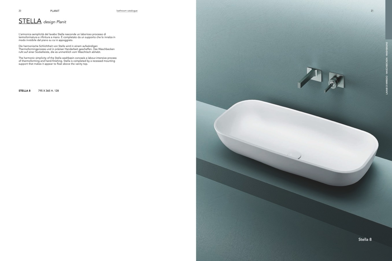 of thermoforming and hand-finishing. Stella is completed by a recessed mounting
