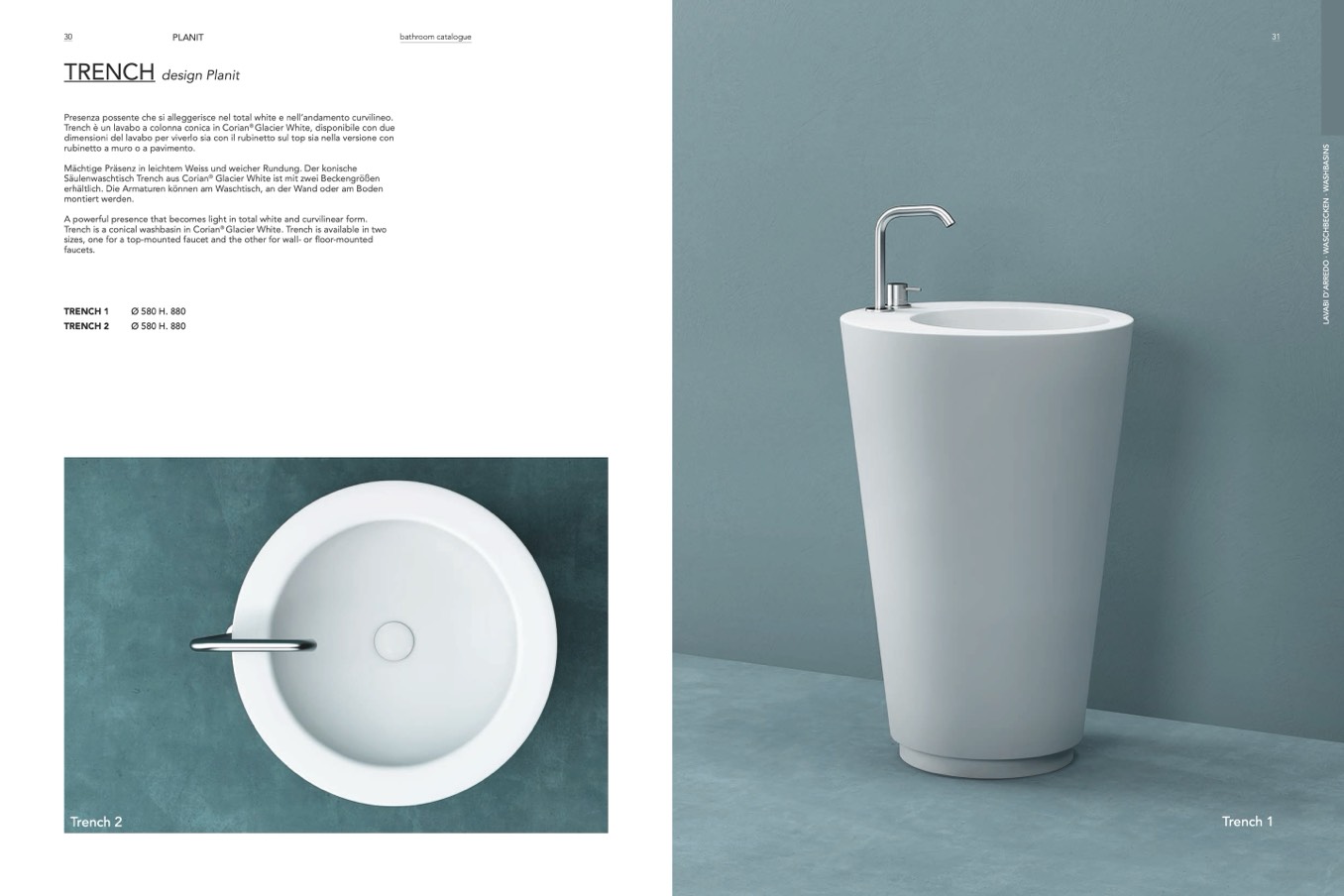 Trench è un lavabo a colonna conica in Corian