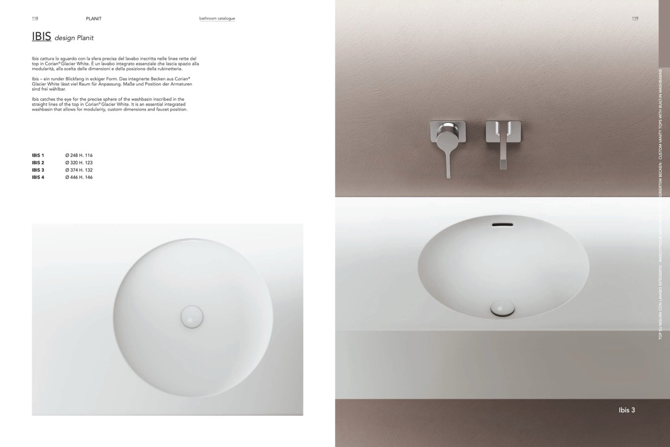 Ibis – ein runder Blickfang in eckiger Form. Das integrierte Becken aus Corian