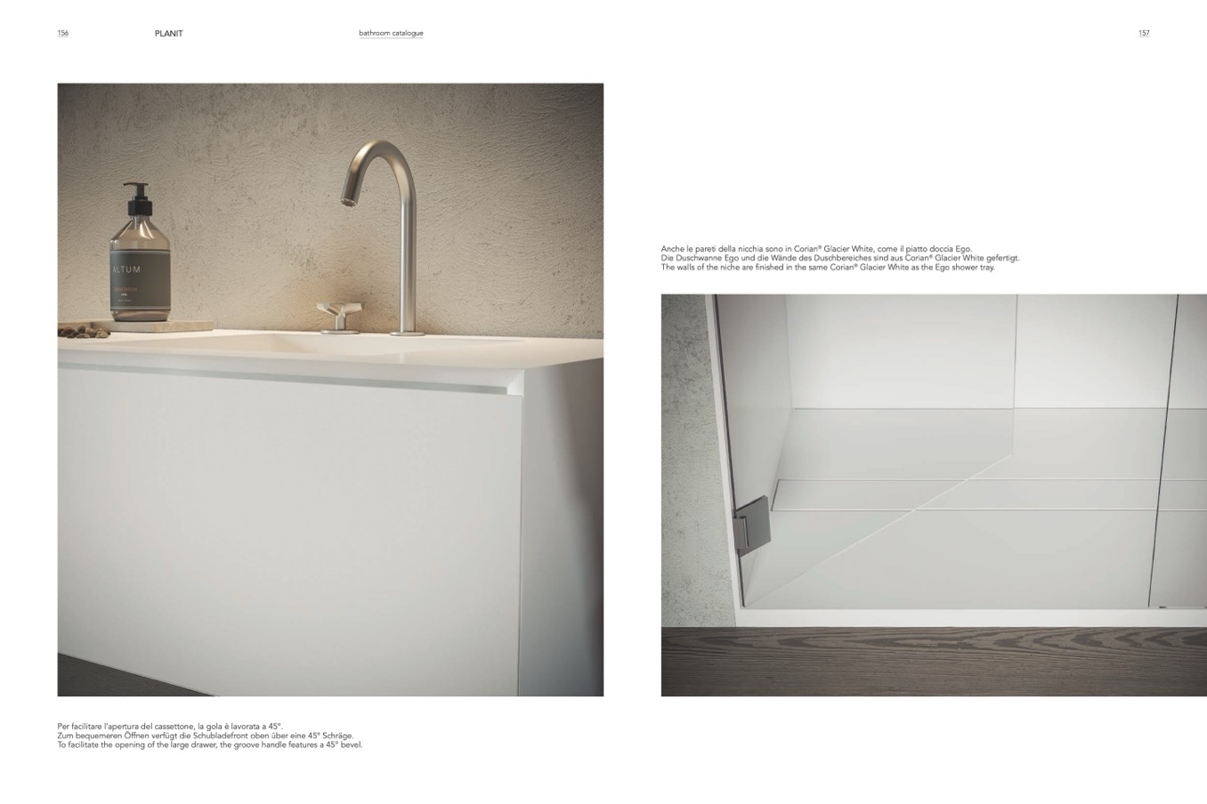 Die Duschwanne Ego und die Wände des Duschbereiches sind aus Corian