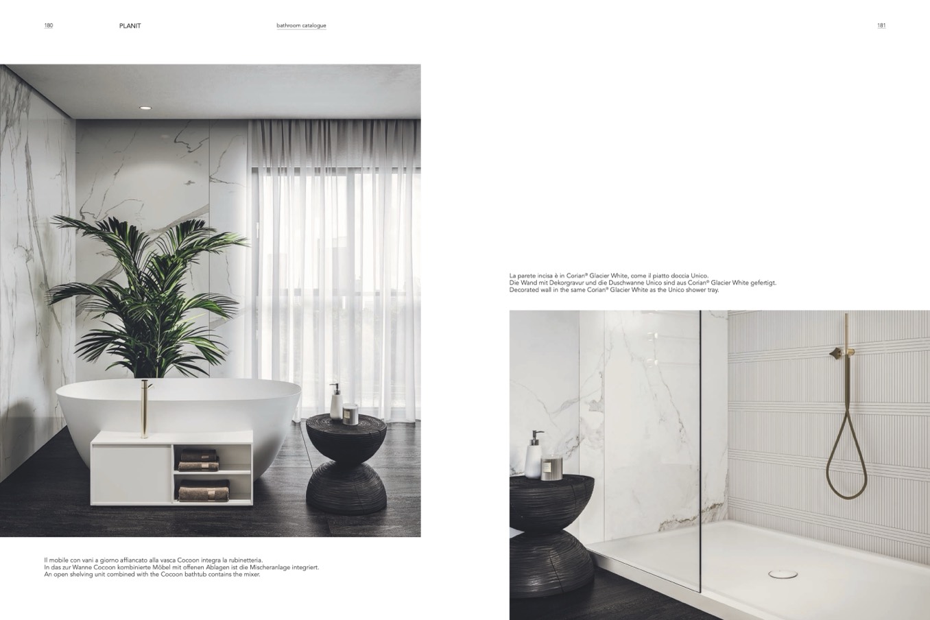 Die Wand mit Dekorgravur und die Duschwanne Unico sind aus Corian