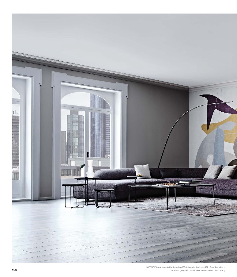 LATITUDE bookcases in titanium - LAMPO A lamp in titanium - SPILLO coffee table in