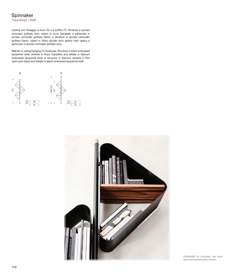 Wall (X) or ceiling-hanging (Y) bookcase. Structure in black embossed