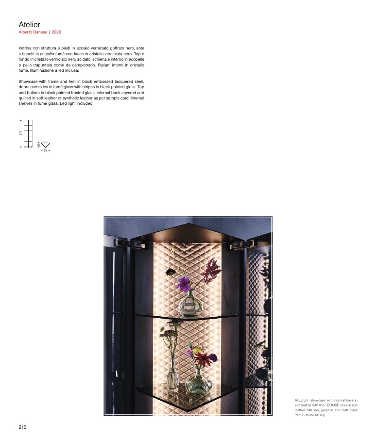 o pelle trapuntata come da campionario. Ripiani interni in cristallo