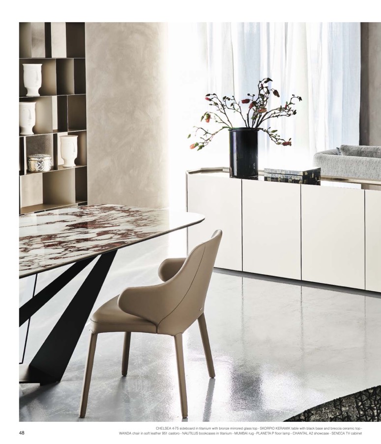 WANDA chair in soft leather 951 castoro - NAUTILUS bookcases in titanium - MUMBAI rug - PLANETA P floor lamp - CHANTAL A2 showcase - SENECA TV cabinet