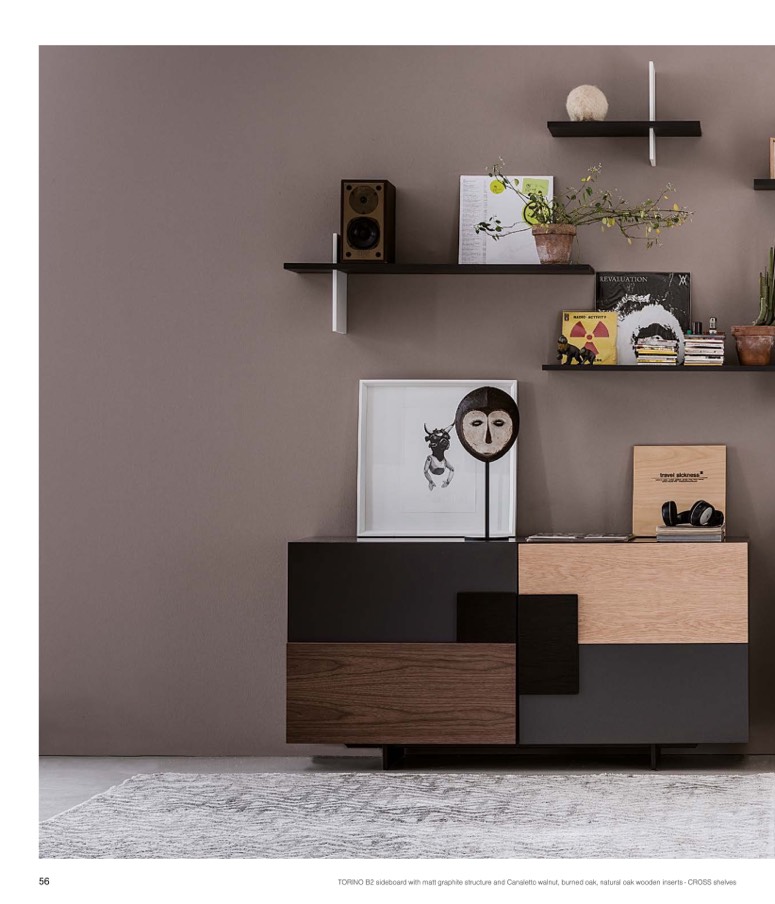 TORINO B2 sideboard with matt graphite structure and Canaletto walnut, burned oak, natural oak wooden inserts - CROSS shelves