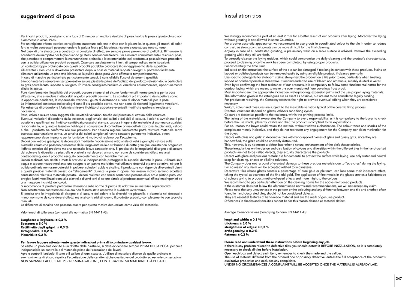 Si precisa che le irregolarità di disegno e di stesura del colore e la diversità tra piastrella e piastrella nei decorati a