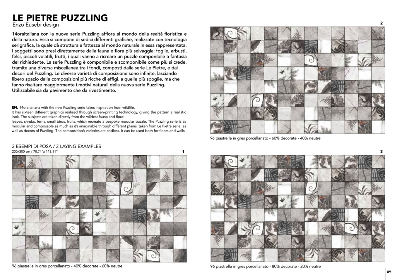 leaves, shrubs, ferns, small birds, fruits, which recreate a bespoke modular puzzle. The Puzzling serie is as