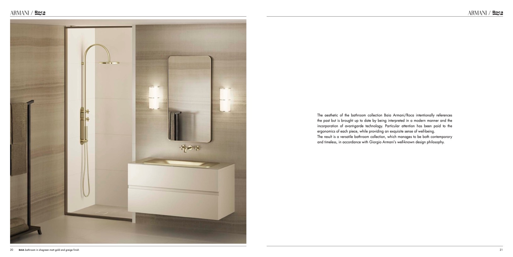The aesthetic of the bathroom collection Baia Armani/Roca intentionally references