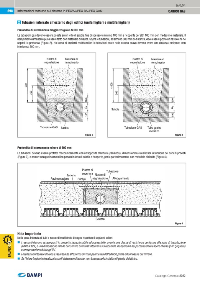 Le tubazioni gas devono essere posate su un letto di sabbia fine di spessore minimo 100 mm e ricoper te per altri 100 mm con medesimo materiale. Il