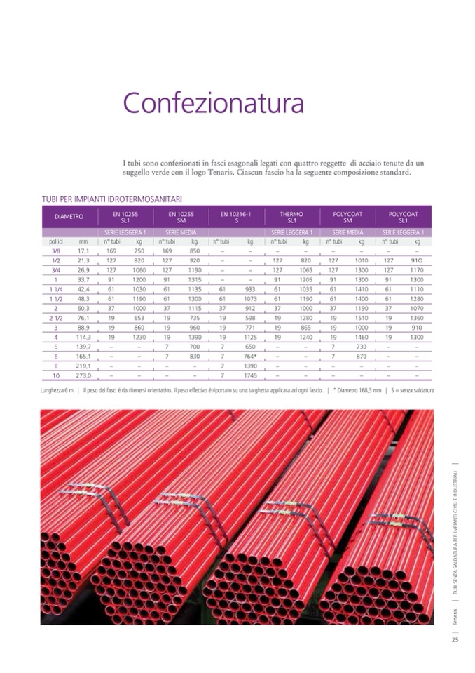 Lunghezza 6 m | Il peso dei fasci é da ritenersi orientativo. Il peso effettivo é riportato su una targhetta applicata ad ogni fascio. | * Diametro 168,3 mm | S = senza saldatura