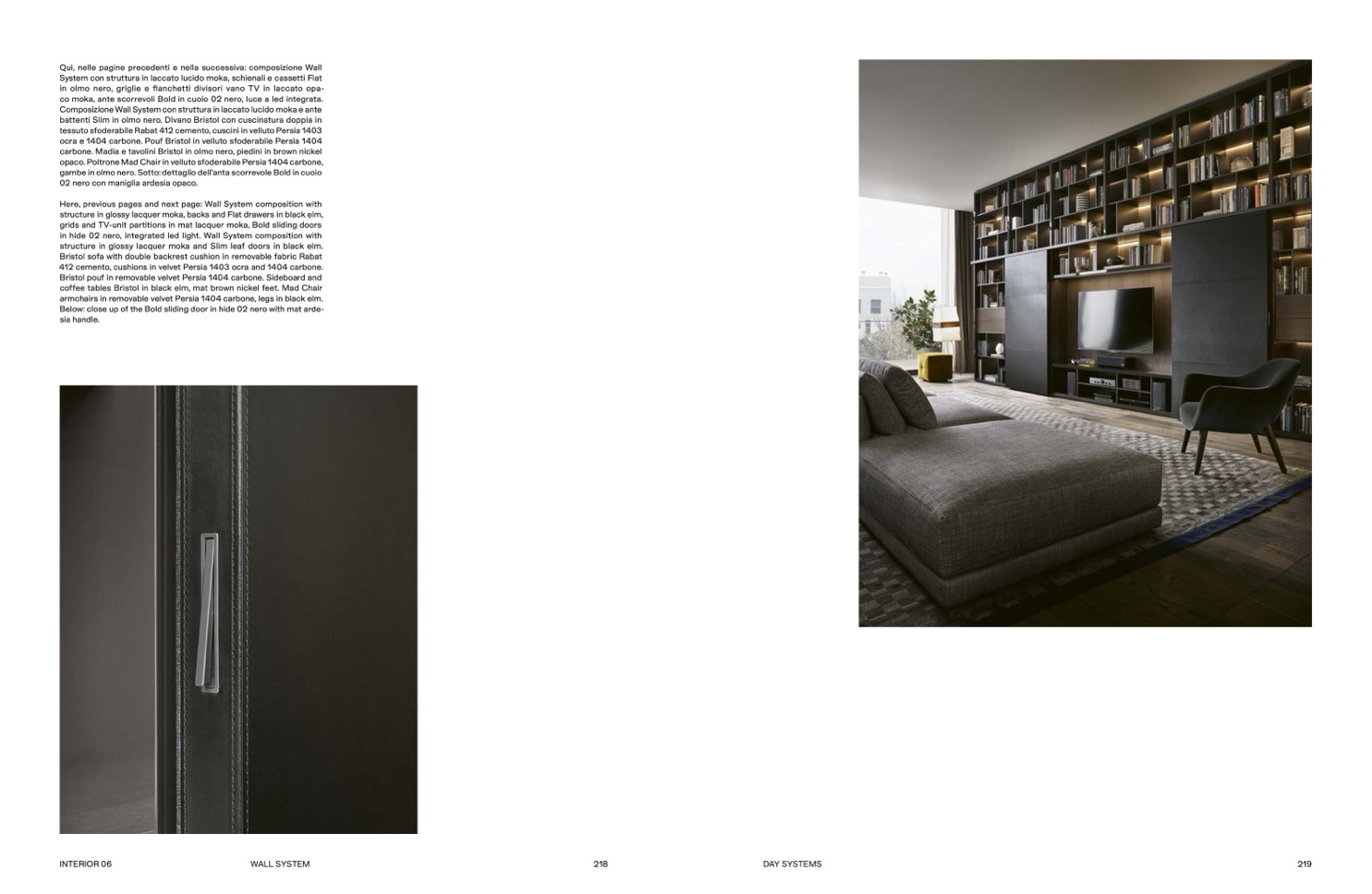 gambe in olmo nero. Sotto: dettaglio dell’anta scorrevole Bold in cuoio