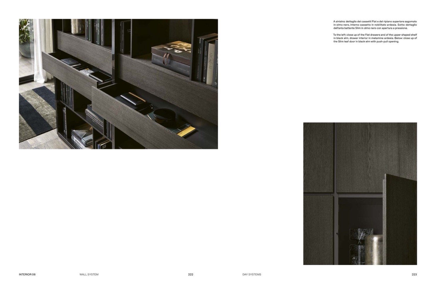 To the left: close up of the Flat drawers and of the upper shaped shelf