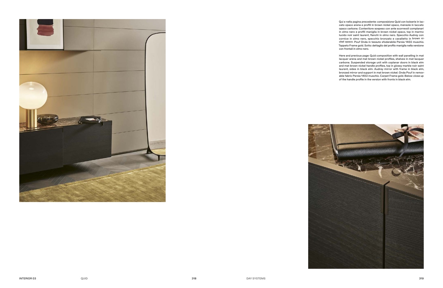 Qui e nella pagina precedente: composizione Quid con boiserie in lac-