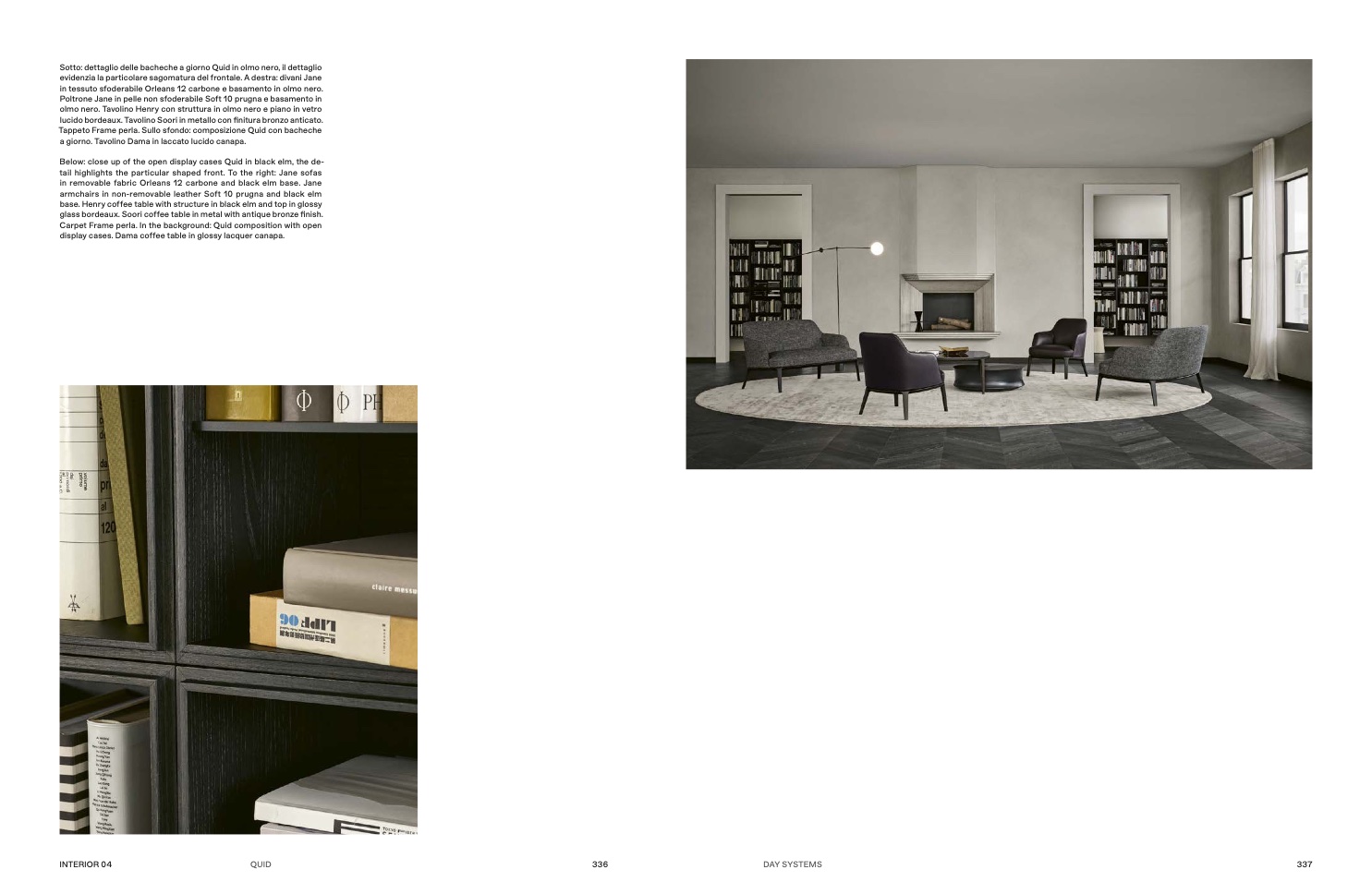 Sotto: dettaglio delle bacheche a giorno Quid in olmo nero, il dettaglio