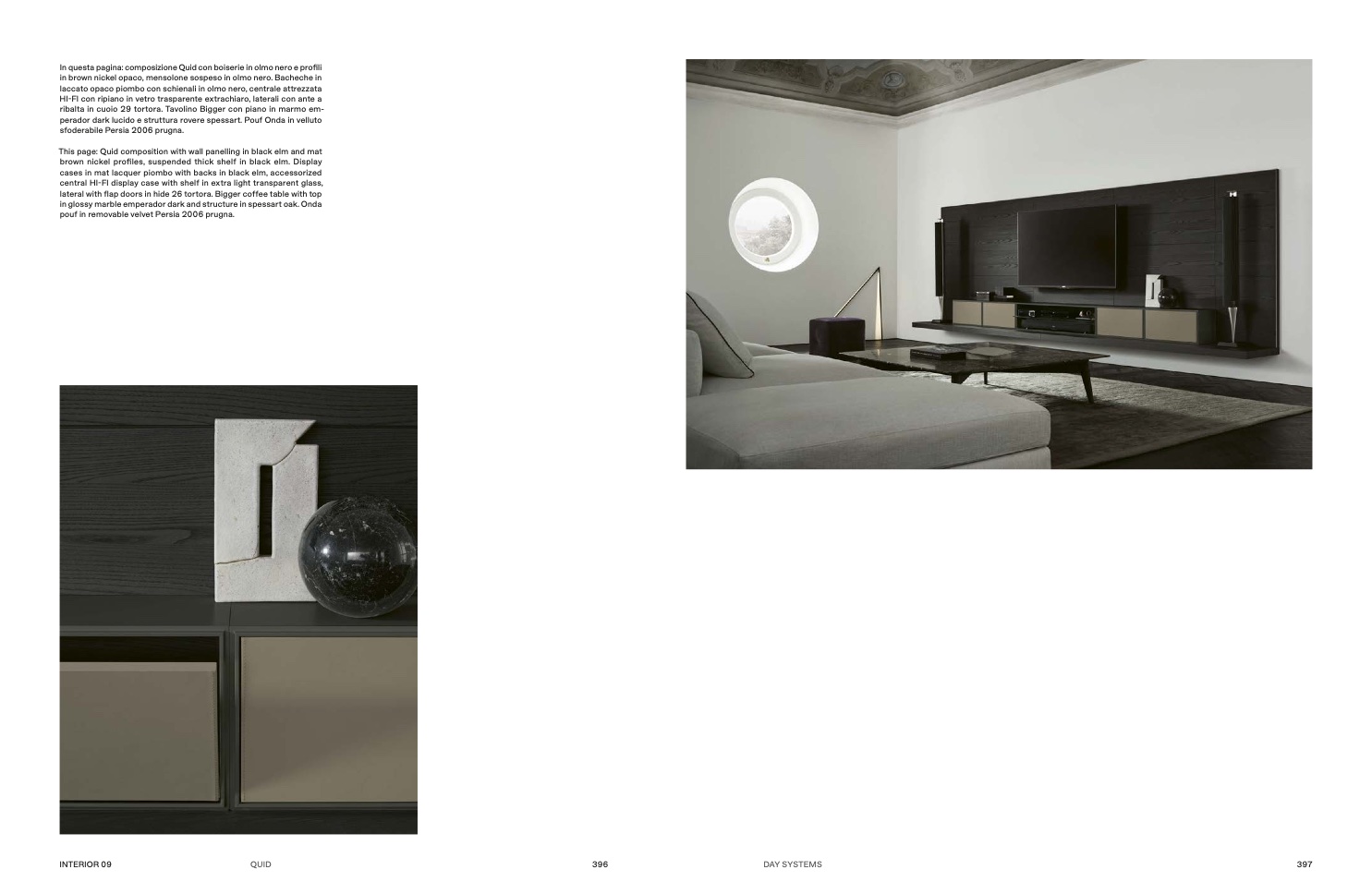This page: Quid composition with wall panelling in black elm and mat