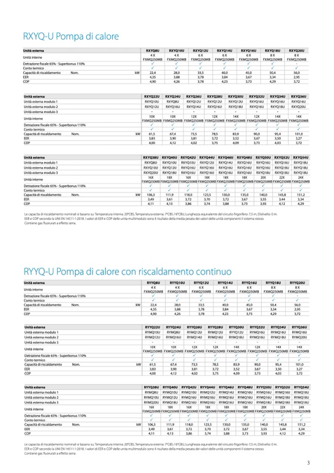 Le capacita di riscaldamento nominali si basano su: Temperatura interna: 20°CBS, Temperatura esterna: 7°CBS / 6°CBU, Lunghezza equivalente del circuito frigorifero: 7,5 m, Dislivello: 0 m.