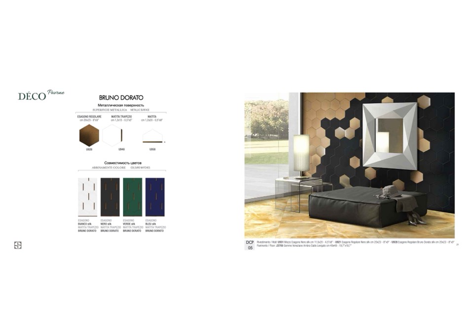 Rivestimento / Wall: U931 Mezzo Esagono Nero silk cm 11,5x20 - 4,5”x8” - U921 Esagono Regolare Nero silk cm 20x23 - 8”x9” - U928 Esagono Regolare Bruno Dorato silk cm 20x23 - 8”x9”
