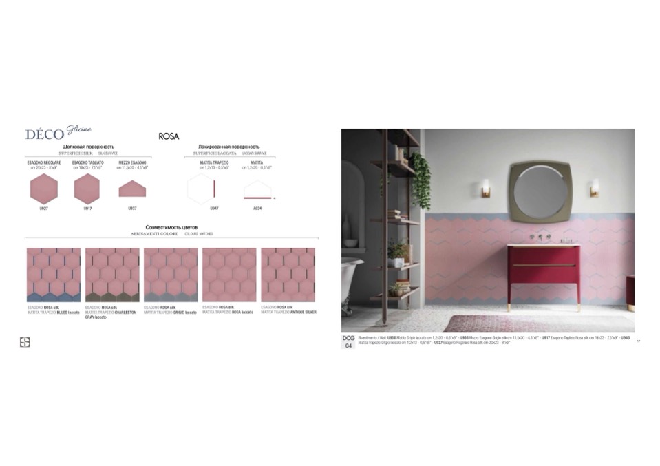Rivestimento / Wall: U956 Matita Grigio laccato cm 1,2x20 - 0,5”x8” - U936 Mezzo Esagono Grigio silk cm 11,5x20 - 4,5”x8” - U917 Esagono Tagliato Rosa silk cm 19x23 - 7,5”x9” - U946
