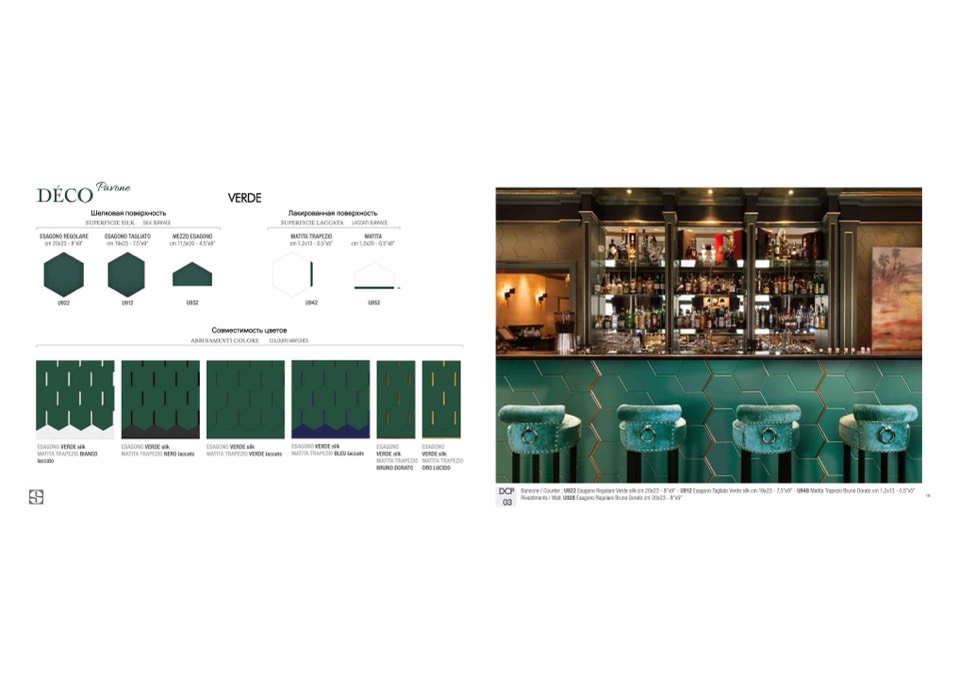 Bancone / Counter : U922 Esagono Regolare Verde silk cm 20x23 - 8”x9” - U912 Esagono Tagliato Verde silk cm 19x23 - 7,5”x9” - U948 Matita Trapezio Bruno Dorato cm 1,2x13 - 0,5”x5”