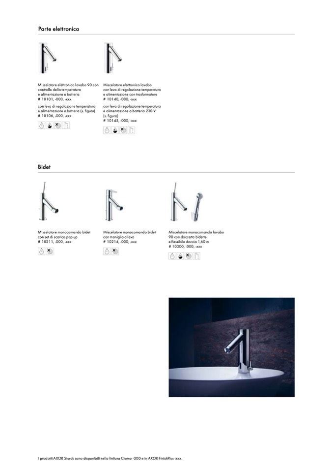 I prodotti AXOR Starck sono disponibili nella finitura Cromo -000 e in AXOR FinishPlus -xxx.