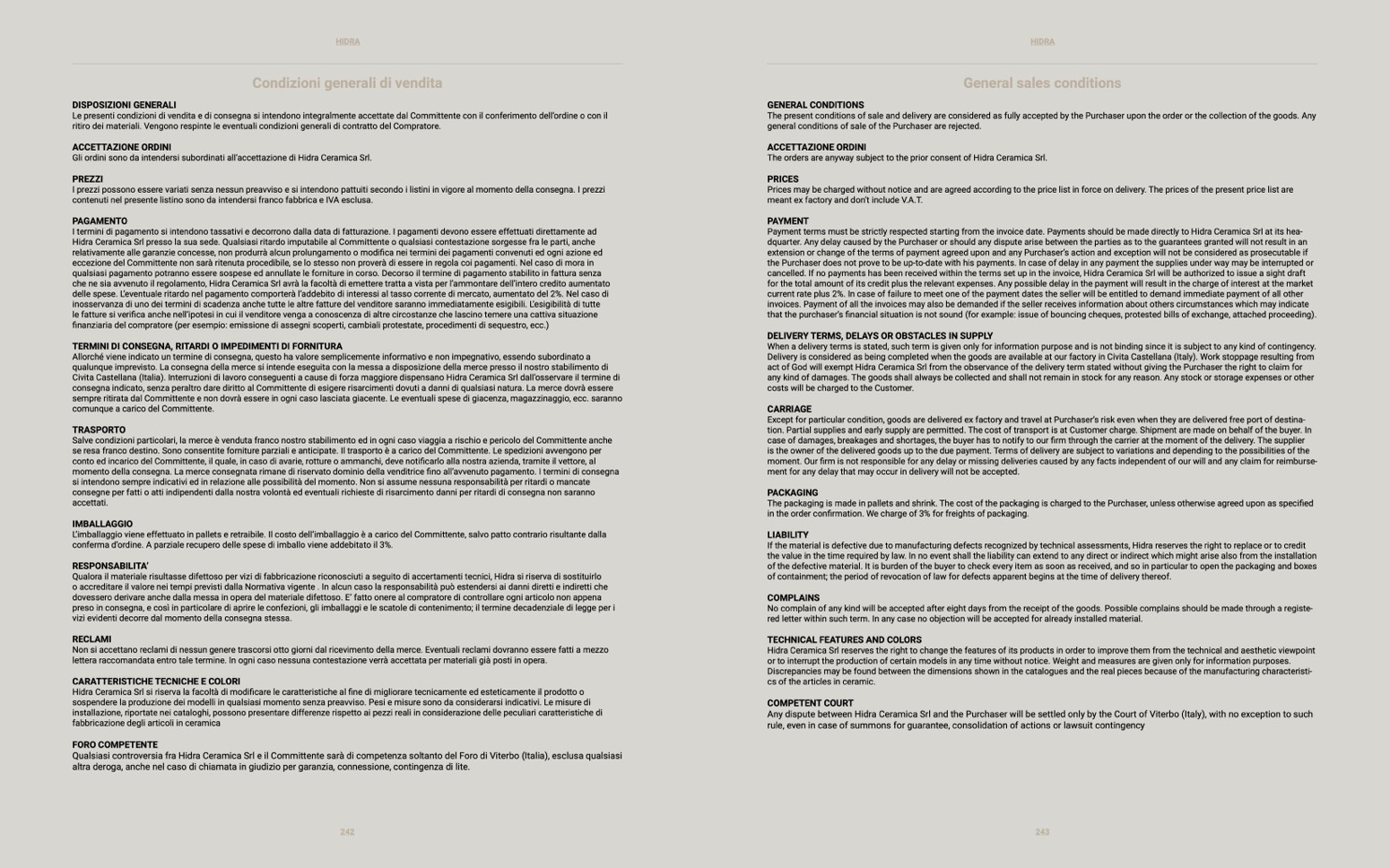 Payment terms must be strictly respected starting from the invoice date. Payments should be made directly to Hidra Ceramica Srl at its hea-
