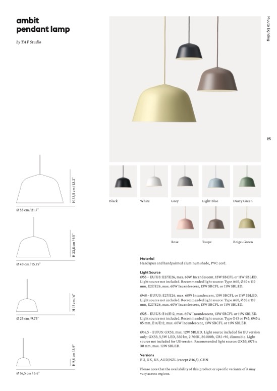 Ø25 – EU/US: E14/E12, max. 60W Incandescent, 13W SBCFL or 11W SBLED.