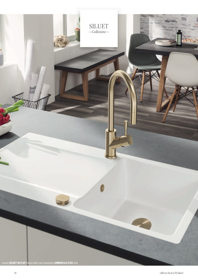 Lavello SILUET 50 FLAT Bianco Alpin con miscelatore UMBRELLA FLEX Gold
