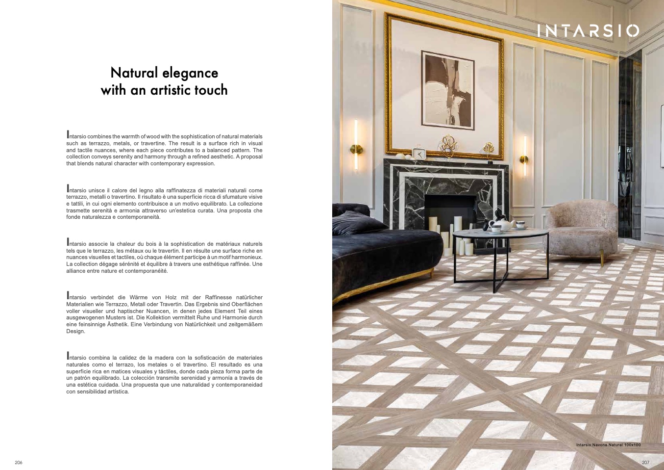Intarsio combines the warmth of wood with the sophistication of natural materials