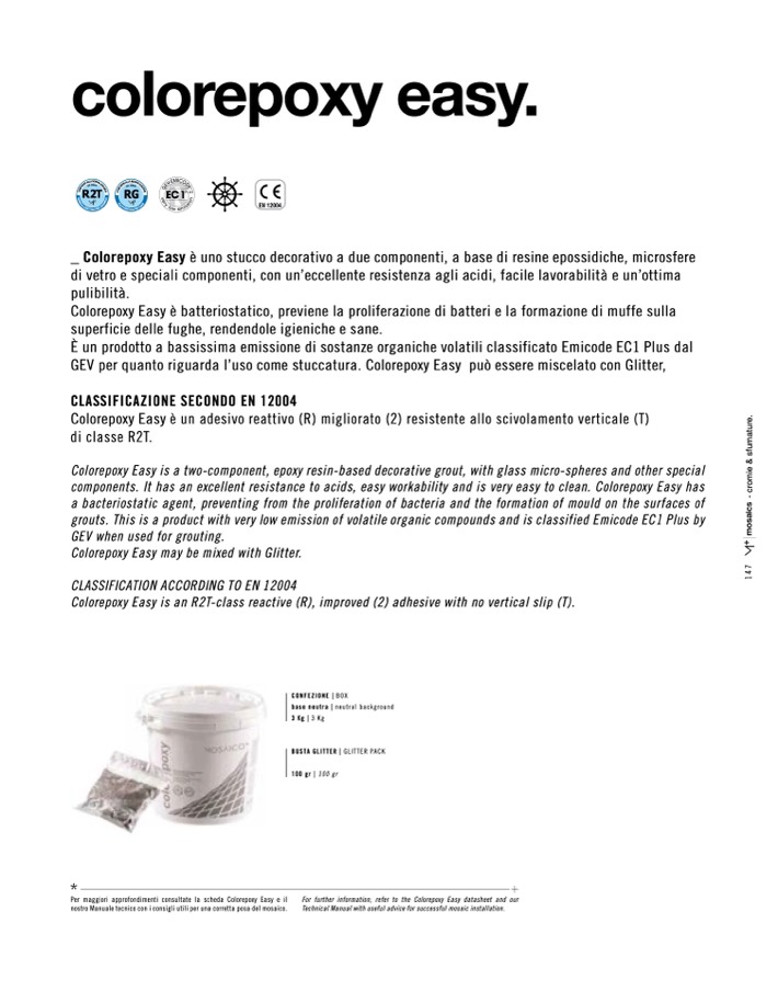 Colorepoxy Easy is a two-component, epoxy resin-based decorative grout, with glass micro-spheres and other special