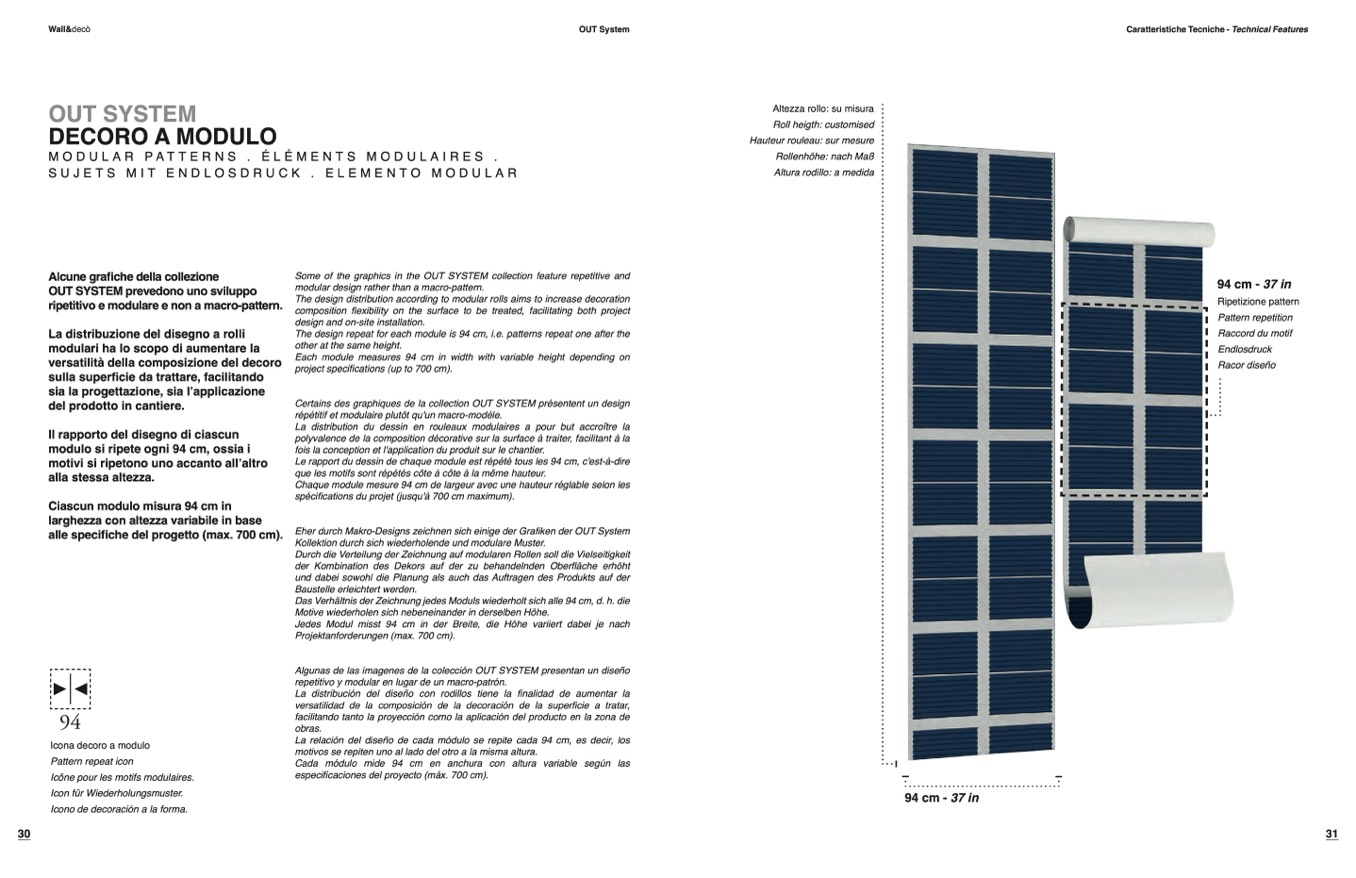 The design repeat for each module is 94 cm, i.e. patterns repeat one after the
