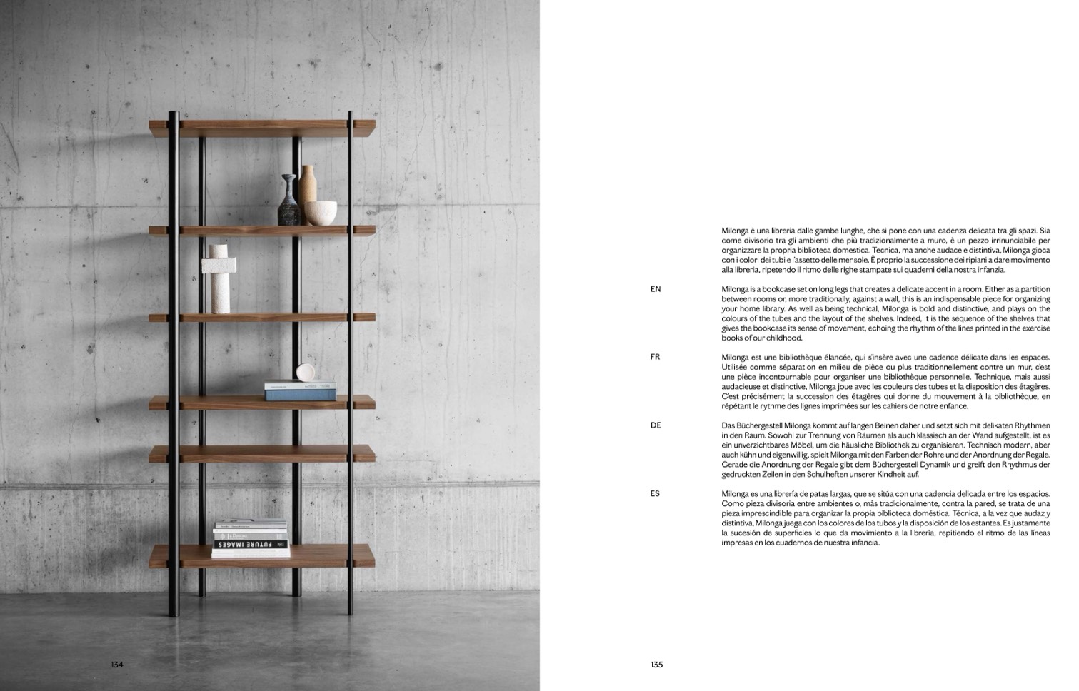 Milonga est une bibliothèque élancée, qui s’insère avec une cadence délicate dans les espaces.