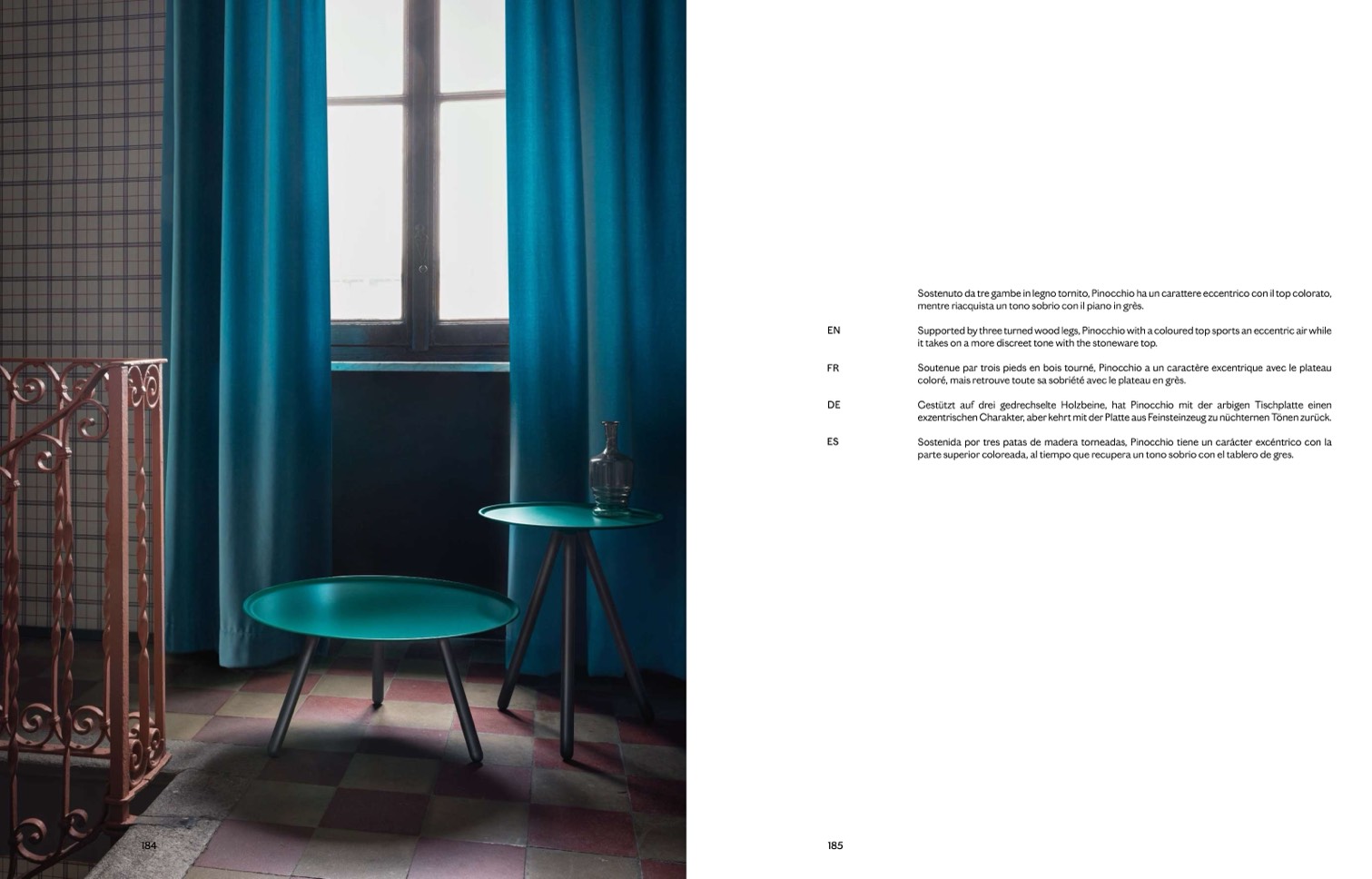Sostenida por tres patas de madera torneadas, Pinocchio tiene un carácter excéntrico con la