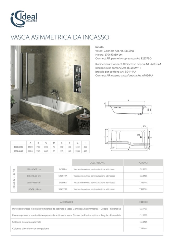 Parete sopravasca in cristallo temperato da abbinarsi a vasca Connect AIR asimmetrica - Doppia - Reversibile