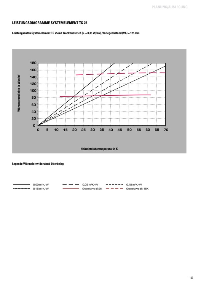 Leistungsdaten Systemelement TS 25 mit Trockenestrich (λ = 0,35 W/mk), Verlegeabstand (VA) = 125 mm