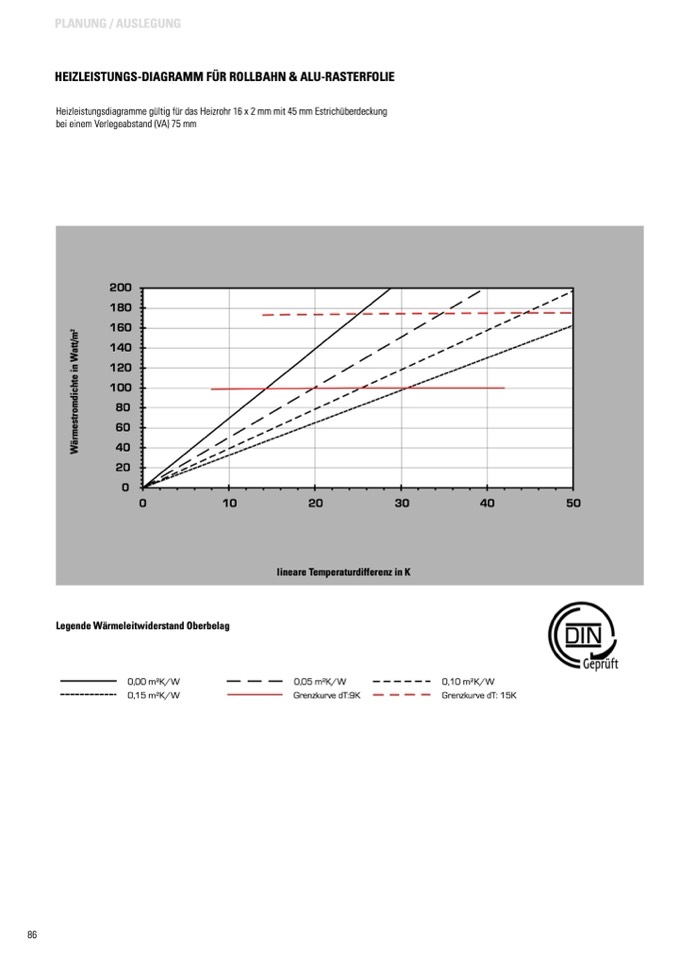 Heizleistungsdiagramme gültig für das Heizrohr 16 x 2 mm mit 45 mm Estrichüberdeckung