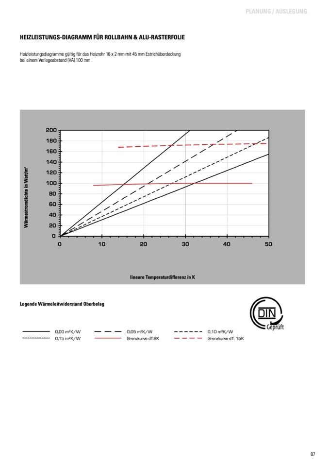 Heizleistungsdiagramme gültig für das Heizrohr 16 x 2 mm mit 45 mm Estrichüberdeckung