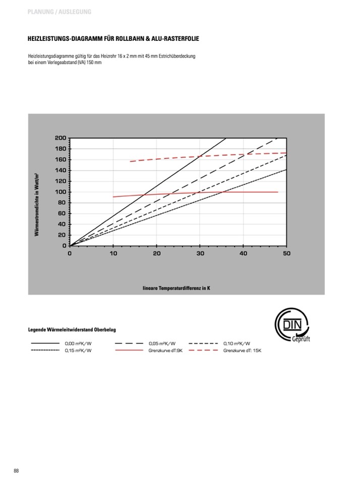 Heizleistungsdiagramme gültig für das Heizrohr 16 x 2 mm mit 45 mm Estrichüberdeckung