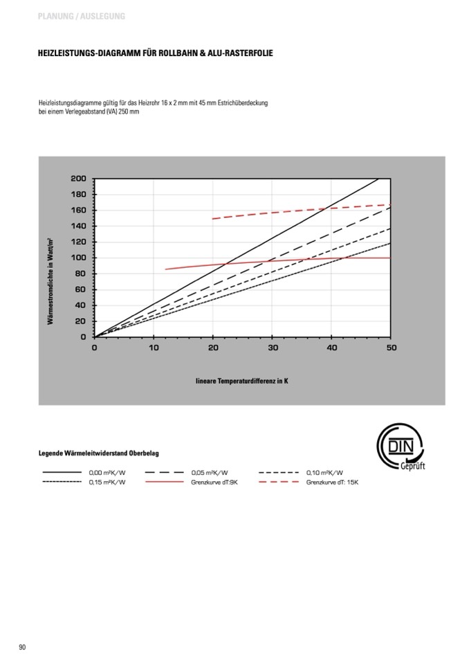 Heizleistungsdiagramme gültig für das Heizrohr 16 x 2 mm mit 45 mm Estrichüberdeckung