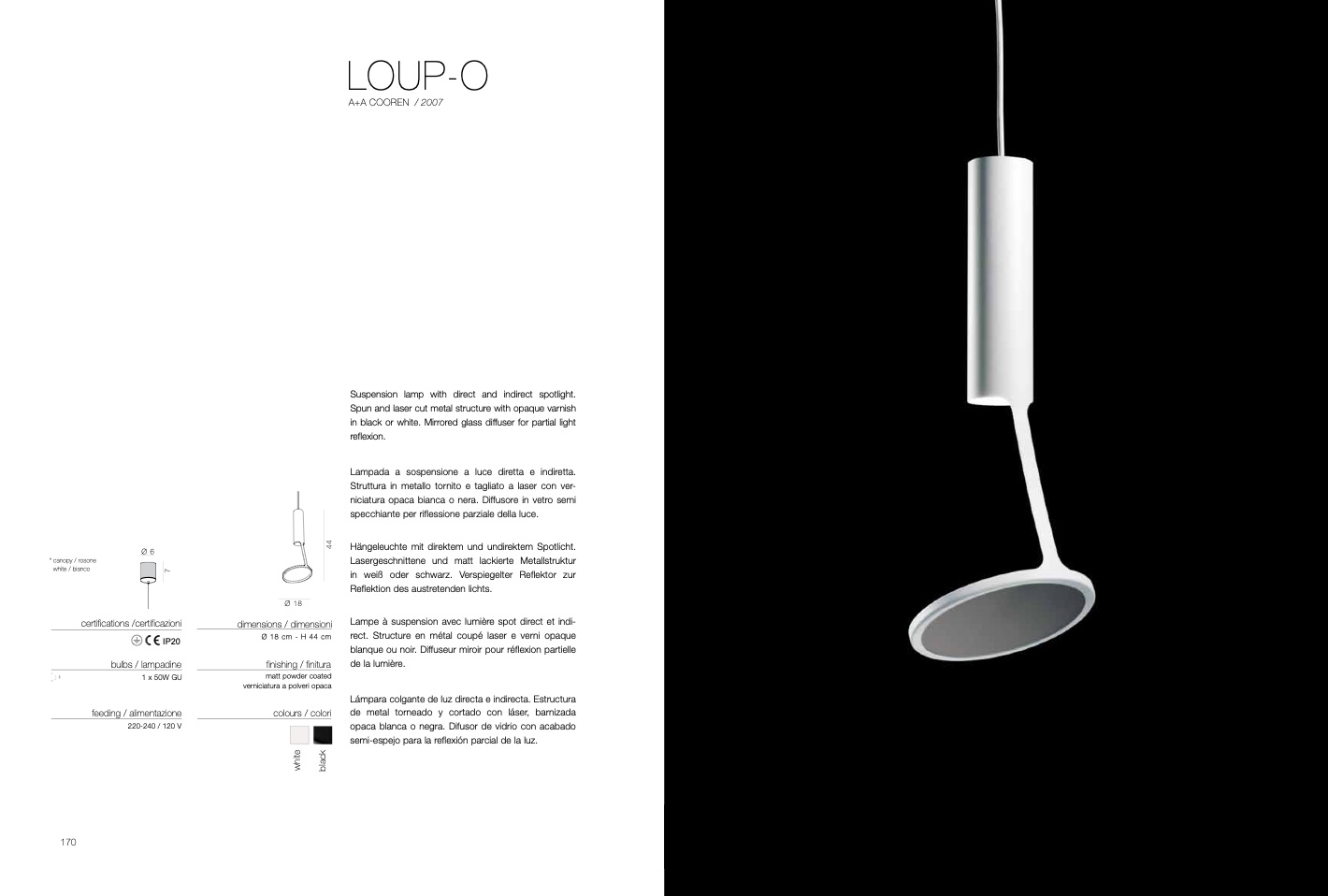 Suspension lamp with direct and indirect spotlight.