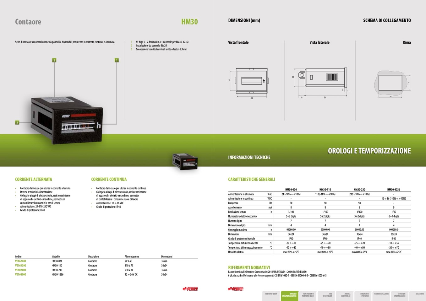 Serie di contaore con installazione da pannello, disponibili per utenze in corrente continua o alternata.