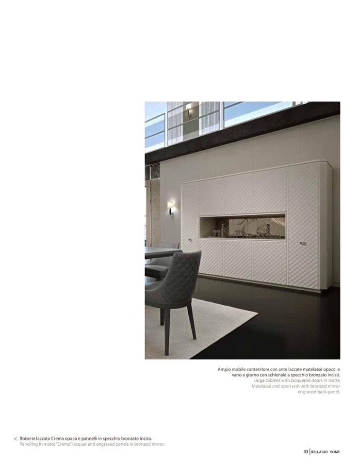 Panelling in matte “Crema” lacquer and engraved panels in bronzed mirror.