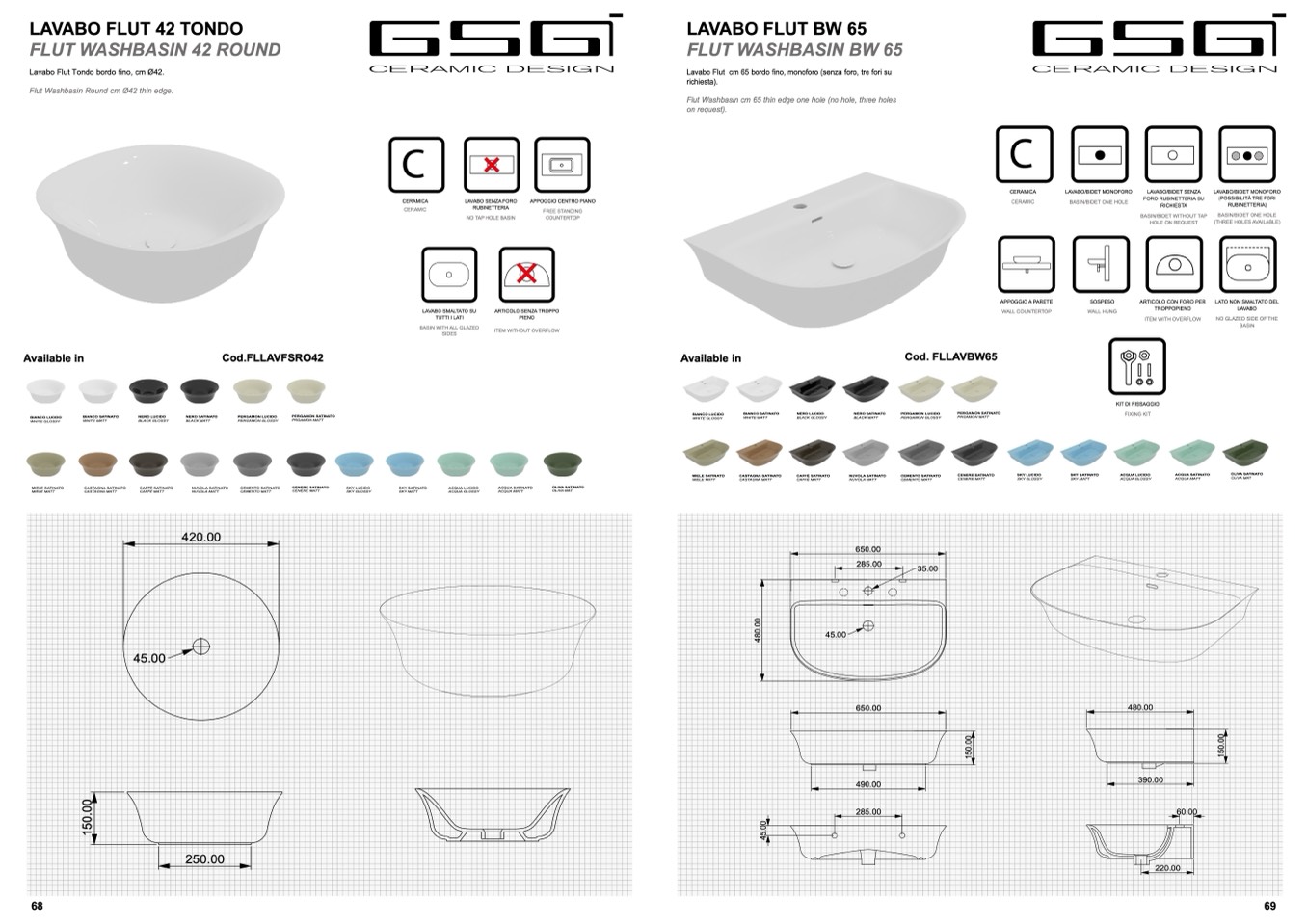 Lavabo Flut cm 65 bordo fino, monoforo (senza foro, tre fori su