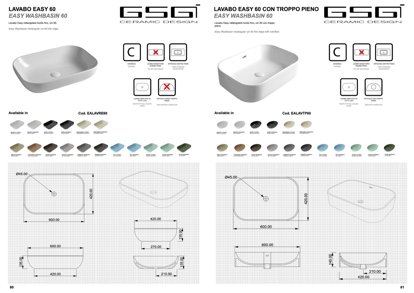 Easy Washbasin rectangular cm 60 thin edge with overflow.